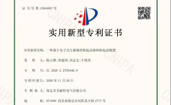 近日,公司又一项专利通过国家知识产权局审查,成功获得专利授权,授权的专利为:实用新型专利《一种基于电子式互感器的软起动器和软起动装置》,专利号ZL202022705446.8。
