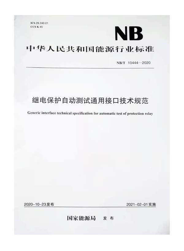 近日,我公司参与起草的行业标准《继电保护自动测试通用接口技术规范》(NB/T 10444-2020)正式出版。标准经国家能源局批准发布,于2021年2月1日开始实施。